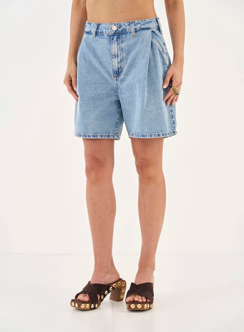 Uma peça que personifica a sofisticação urbana e o frescor da moda italiana, transformando o jeans em uma expressão de alma e estilo. Esta bermuda traduz a harmonia entre o casual e o refinado, apresentando uma modelagem média com pregas laterais que conferem um volume arquitetônico e uma silhueta altiva. O design de cintura alta revela a beleza do vestir com intenção, sendo o símbolo máximo de versatilidade para o Outono 26 da Colcci.