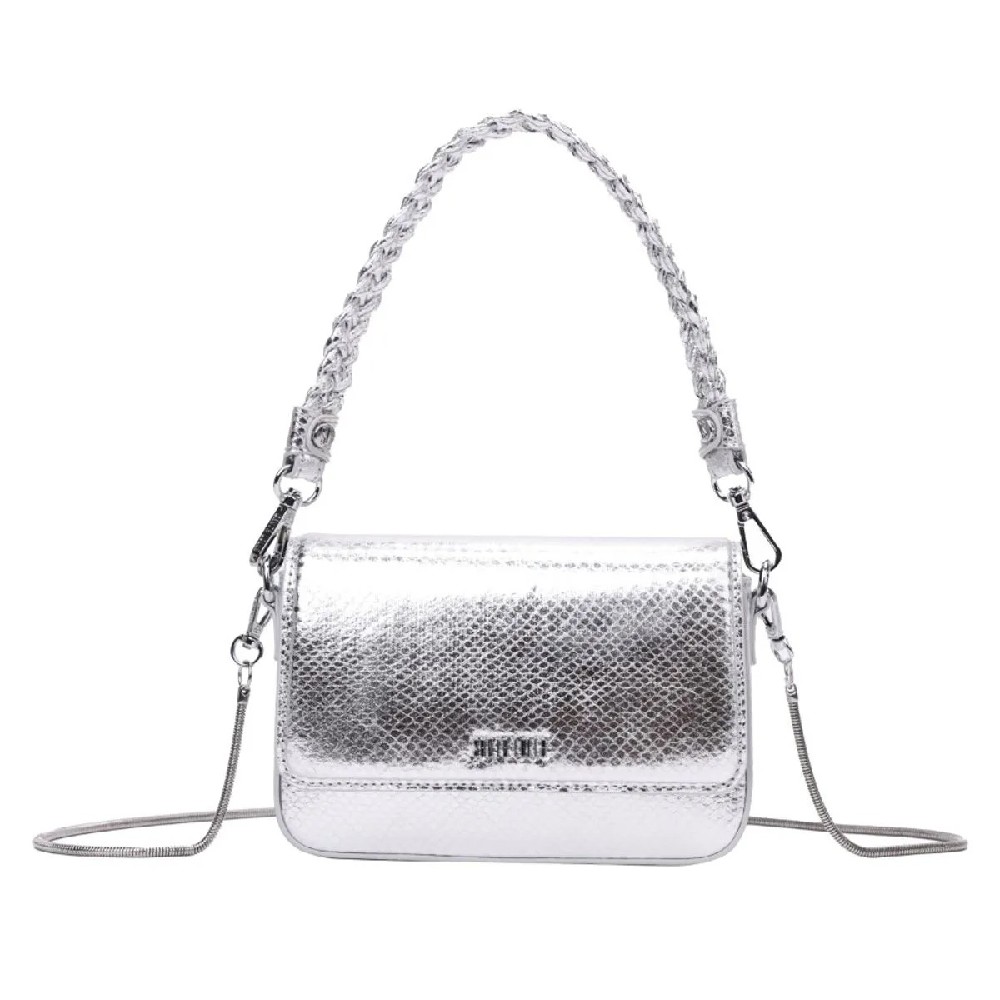 Bolsa confeccionada em material tecnológico metalizado com textura que imita pele de cobra, oferece um toque de luxo e versatilidade para várias ocasiões. Um dos destaques deste modelo é sua alça superior trançada, que confere um visual diferenciado e artesanal, proporcionando conforto e elegância no uso como bolsa de mão. Além disso, a bolsa possui uma alça fina dourada, que pode ser usada para carregá-la no ombro ou de forma transversal, oferecendo versatilidade no estilo. O logo discreto em metal dourado e as ferragens complementam o design sofisticado, tornando-a ideal para carregar itens essenciais com praticidade e requinte.Tamanho da Bolsa