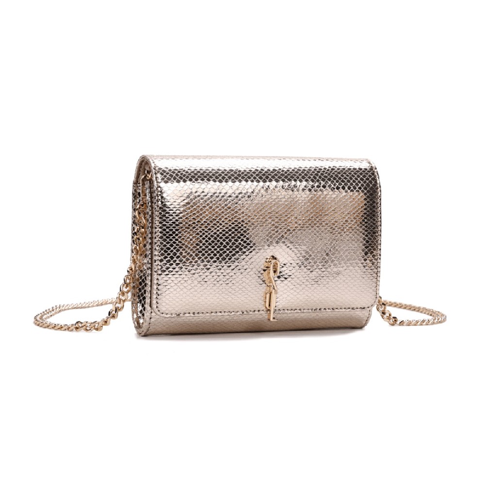 BOLSA CARTEIRA SANTA LOLLA METALIZADA DOURADA ALÇA CORRENTE TRANSVERSAL