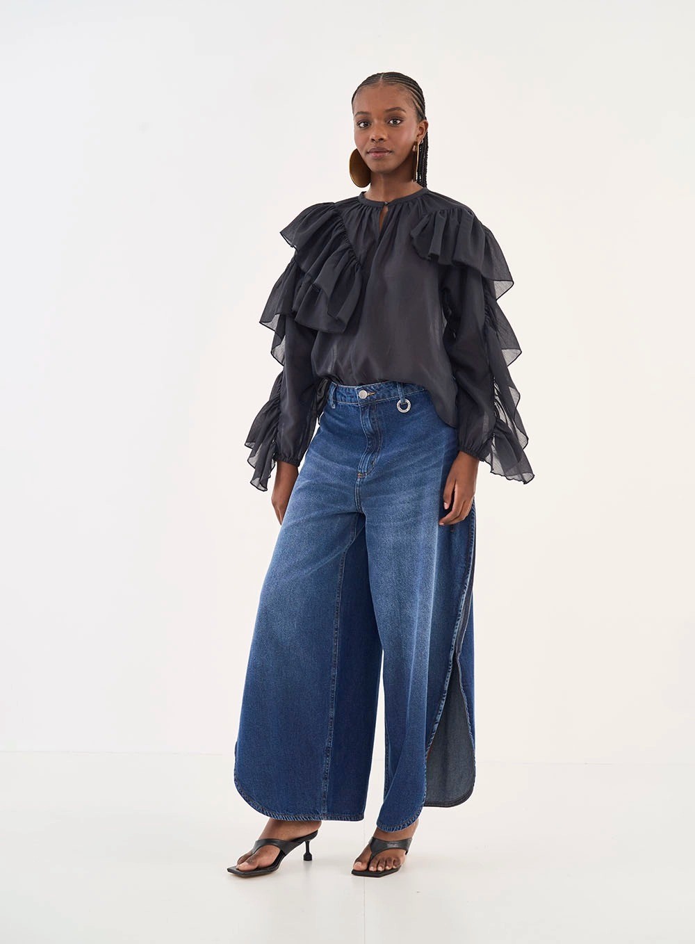 Design: A cintura alta esculpe o corpo com autoridade, enquanto o corte amplo ganha uma nova dimensão com as fendas laterais profundas, que revelam a pele de forma sensual e garantem um movimento fluido e encantador ao caminhar.