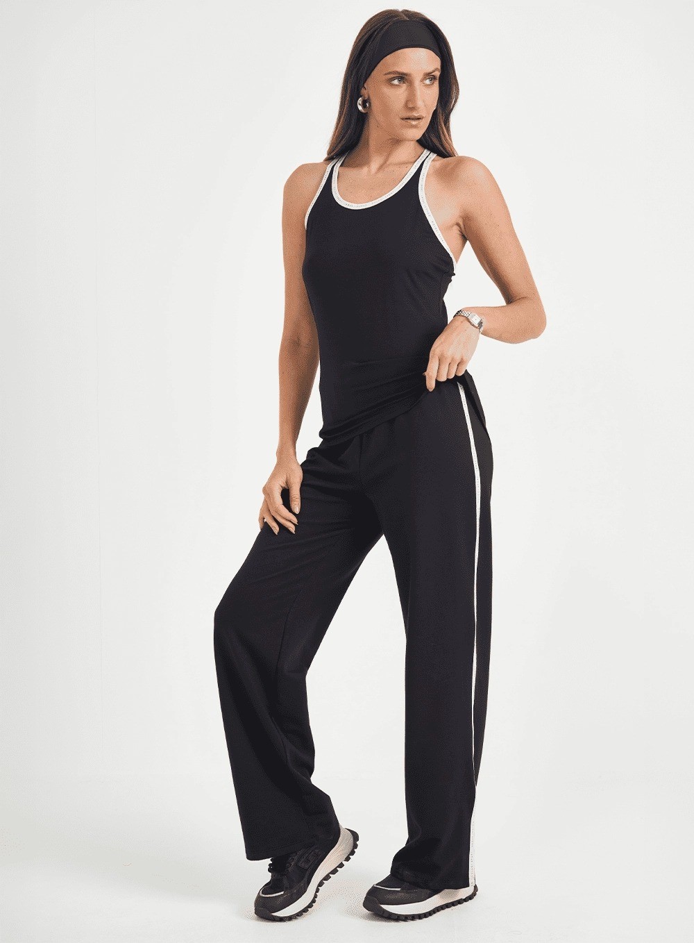 Design: O corte reto e fluido alonga a silhueta, enquanto a faixa lateral contrastante adiciona um toque dinâmico e moderno, característico do estilo athleisure.