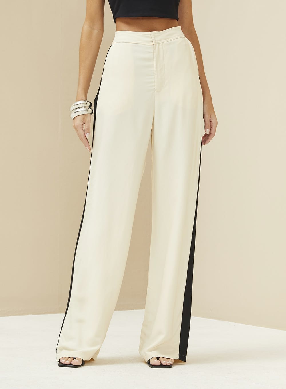 Calça Feminina Alfaiataria Com Listra Lateral urban breeze primavera.Esta calça é a expressão máxima da sofisticação despojada. Ela une a elegância atemporal da alfaiataria com a modernidade de uma listra lateral contrastante, criando um visual que é ao mesmo tempo clássico e inovador. Inspirada na interação entre a cidade e o mar, esta peça oferece um caimento impecável e uma sensação de leveza, sendo a escolha perfeita para a mulher que transita com fluidez por diferentes ambientes, sempre com um toque de estilo e bem-estar.Calça: Peça com modelagem reta e ampla, de cintura alta, que alonga e valoriza a silhueta. Possui fechamento frontal por zíper e botão, passantes para cinto e bolsos faca laterais.Cor: Off-white com uma marcante listra lateral preta, um duo cromático que exala elegância e versatilidade.Tecido: Confeccionada em 100% Viscose, oferece um toque sedoso, caimento fluido e uma leveza refrescante, perfeita para os dias de primavera. A sua funcionalidade Easy Care torna