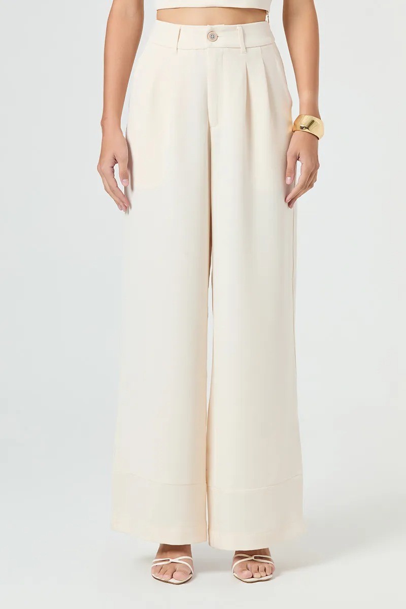 Calça wide leg em crepe alfaiataria, perfeita para composiç ões elegantes e sofisticadas. O cós estruturado com pregas tombadas garante um caimento impecável e confortável, enquanto o martingale nas costas com botões adiciona um toque refinado e contemporâneo. Com acabamento invisível na barra e bolsos frontais bem posicionados, é uma peça que une design moderno e alfaiataria clássica com maestria. Ideal para ocasiões em que elegância e estilo caminham juntos.