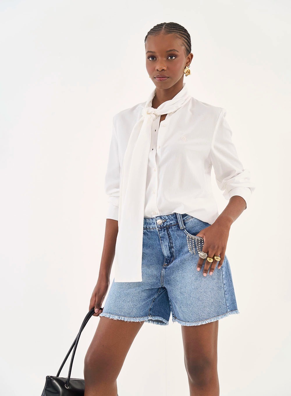Características:Tecido: Confeccionada em um blend nobre de 52% Viscose, 29% Algodão e 19% Modal. Esta união proporciona um toque sedoso incomparável, frescor e um caimento fluido que dialoga perfeitamente com o movimento natural do corpo.Design: Modelagem comfort de mangas longas com punhos abotoados e gola alta que se estende em faixas para amarração em laço, criando uma silhueta feminina, sofisticada e encantadora.Detalhes: Apresenta fechamento frontal por botões delicados, punhos estruturados e a icônica placa metálica da COLCCI aplicada na parte posterior da gola, selando a peça com o DNA