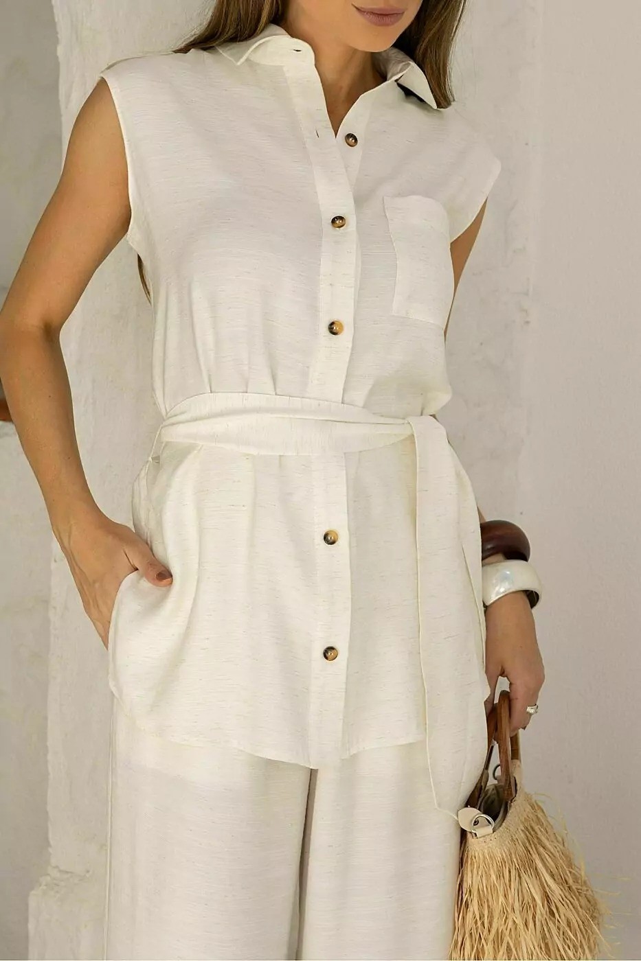 Camisa sem manga em alfaiataria twill bolso, botões frente, martingale com botão ombro e faixa solta para amarração.86% Viscose 9% Poliester 5% Linho.REF:013371