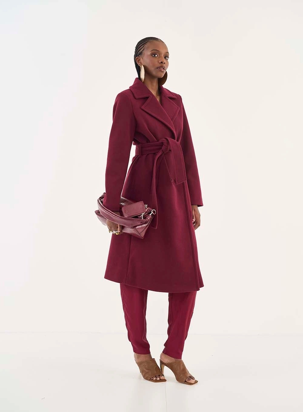 Uma peça de alfaiataria statement que exala poder e sofisticação. Com modelagem Comfort alongada (comprimento midi), este sobretudo envolve o corpo com elegância. Possui gola de lapela larga clássica e uma faixa robusta para amarração na cintura, permitindo esculpir a silhueta ou usar a peça aberta para um visual mais fluido. A fenda posterior garante movimento ao caminhar.