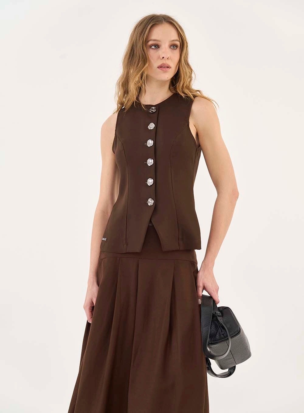 Detalhes: O grande protagonista da peça é o fechamento frontal com botões metálicos de design irregular e orgânico, que funcionam como verdadeiras esculturas sobre o tom profundo da peça. Apresenta decote arredondado fechado e recortes anatômicos frontais que desenham o busto e a cintura com sensualidade e requinte.