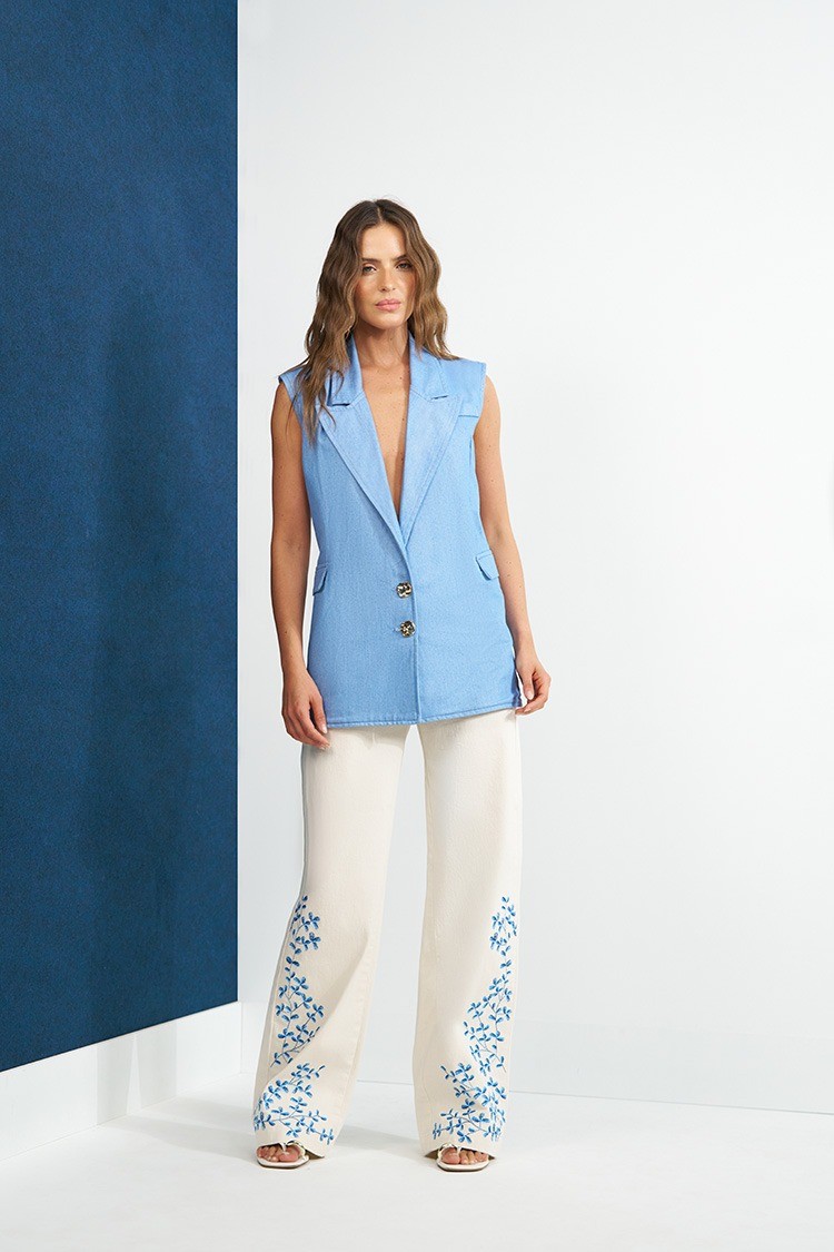 O Colete Slywear na cor Azul Claro é uma peça de alfaiataria moderna que confere sofisticação e estilo contemporâneo. Confeccionado em um tecido leve que imita o denim, este colete possui modelagem oversized (mais longa e reta) e sem mangas, seguindo o estilo colete de blazer. Possui gola lapela clássica, fechamento frontal por botões e bolsos frontais embutidos ou decorativos. A cor azul claro, aliada à estrutura de alfaiataria, torna-o perfeito para ser usado como terceira peça, sobre blusas básicas ou camisas, ou até mesmo como peça única, combinando com calças ou shorts do mesmo tecido para um visual monocromático elegante.REF:550.031