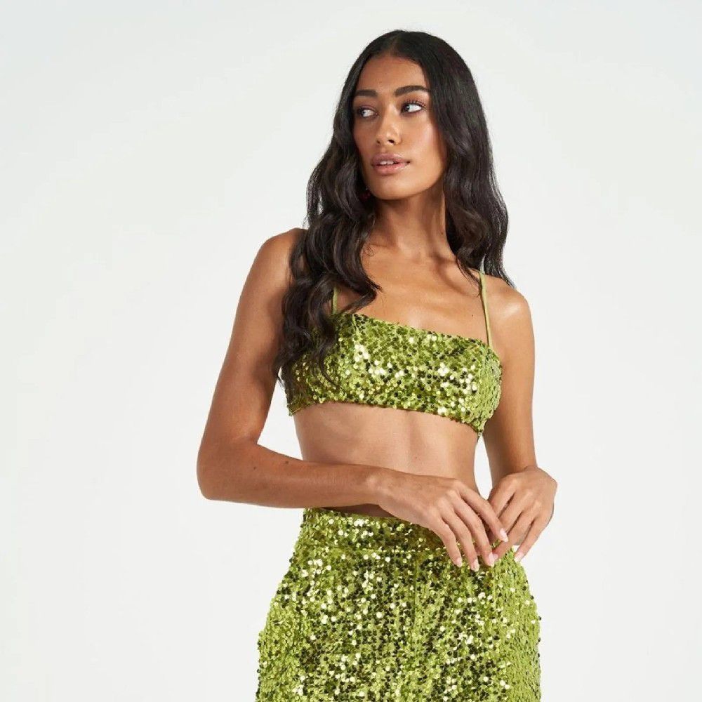 Top apresenta shape reto e modelagem de alfaiataria. A peça possui tecido de paetê exclusivo, decote reto com alças finas reguláveis e abertura na parte traseira com botões perolados. Características Composição: 100% Poliéster - Forro: 95% Viscose, 5% Elastano.