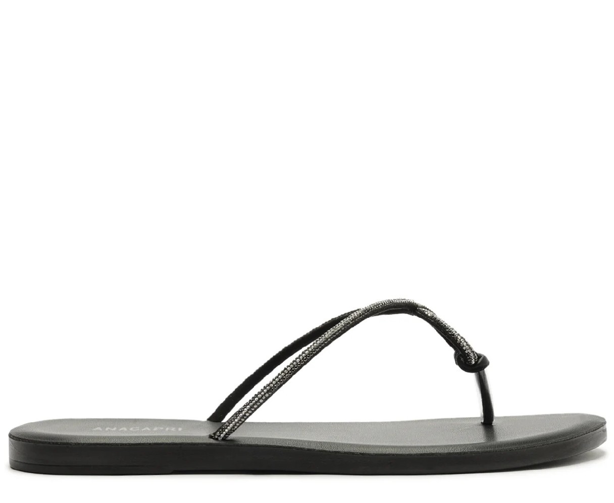 Rasteira de tiras tradicionais com efeito glam, na cor preta. O modelo possui solado rasteiro emborrachado e biqueira arredondada. Traz cabedal com tira central em rolotê com aplicação de strass que passa entre os dedos e cruza pelo peito do pé, com arremate vazado na parte superior da gáspea. Com palmilha comfy e assinatura Anacapri.Material: Multimaterial Cor: Preto Referência: C3034600100001