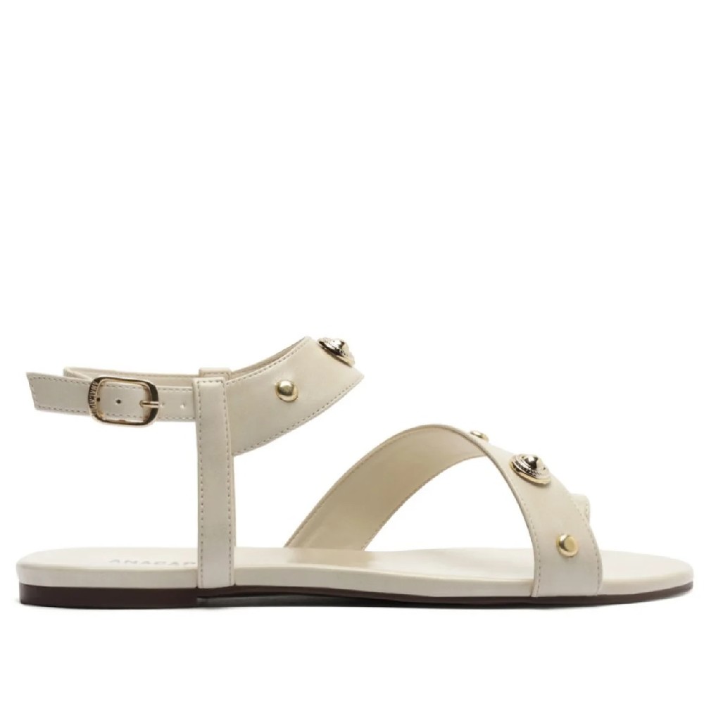 Rasteira de três tiras, com adorno metálico, na cor branca. De material similar ao couro e biqueira arredondada, possui solado emborrachado, com leve saltinho traseiro. O modelo traz cabedal com trio de tiras médias: uma sobre o dedão e outra que perpassa em curva no peito de pé presa na lateral. Traz uma tira mais grossa sobre o peito de pé, presa pelas laterais, conectada na tira que contorna o calcanhar e o tornozelo, com fecho afivelado lateral. Apresenta detalhes para aplicação de adornos metálicos imponentes nas tiras. Traz palmilha confortável no mesmo tom da rasteirinha, com assinatura Anacapri.Cor: Branco