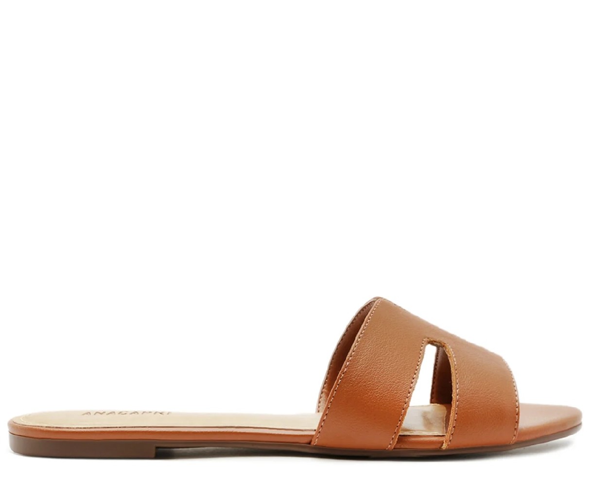 Rasteira Recortes Tira H Marrom. A rasteirinha, que lembra um slider, apresenta cabedal em tiras geométricas vazadas: duas tiras largas em material similar ao couro, com design de recortes sobre a gáspea. Aberta, de biqueira redonda, traz palmilha nude com contorno em pespontos e assinatura Anacapri. O modelo deixa os dedos e calcanhar totalmente à mostra.Material: Material Tecnológico Cor: Marrom Tamanho do salto: 0.7cm Referência: C002950413001520