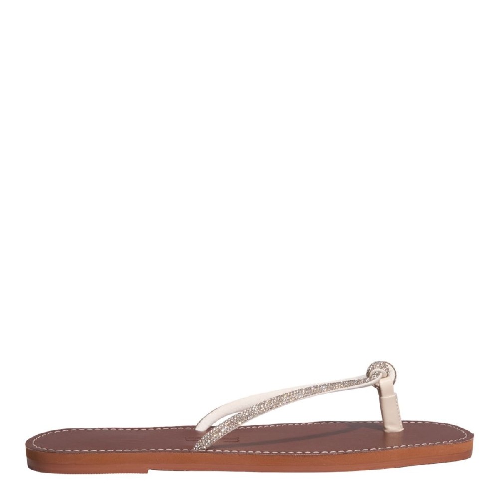 Rasteira feminina confeccionada em material tecnológico, modelo de tiras finas decoradas com brilhos e detalhe de nó frontal, possui salto flat e bico quadrado, combinando elegância e conforto para looks casuais e sofisticados. Tipo de Bico:Quadrado Cor:Prata Material:Material Tecnológico Altura aproximada:1,5 cm Altura do Salto:Flat Código de Referência:04AB.451A.0406.0235