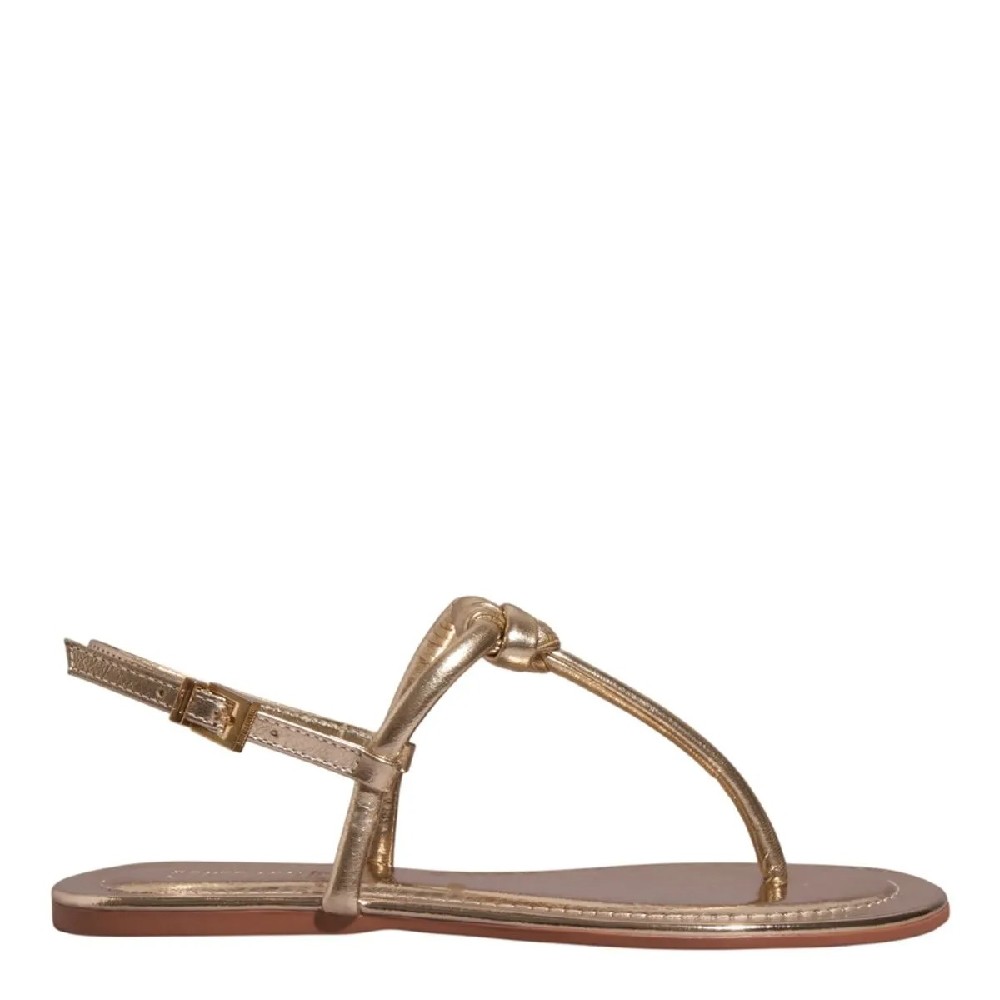 Rasteira confeccionada em napa soft, com detalhe em nó no cabedal que adiciona charme e sofisticação ao design. Leve e confortável, é ideal para composições casuais que combinam estilo e praticidade. Tipo de Bico Redondo Cor Dourado Material Metalizado Fechamento Fivela Altura aproximada 0,5 cm Código de Referência 07D2.5808.0A14.001D
