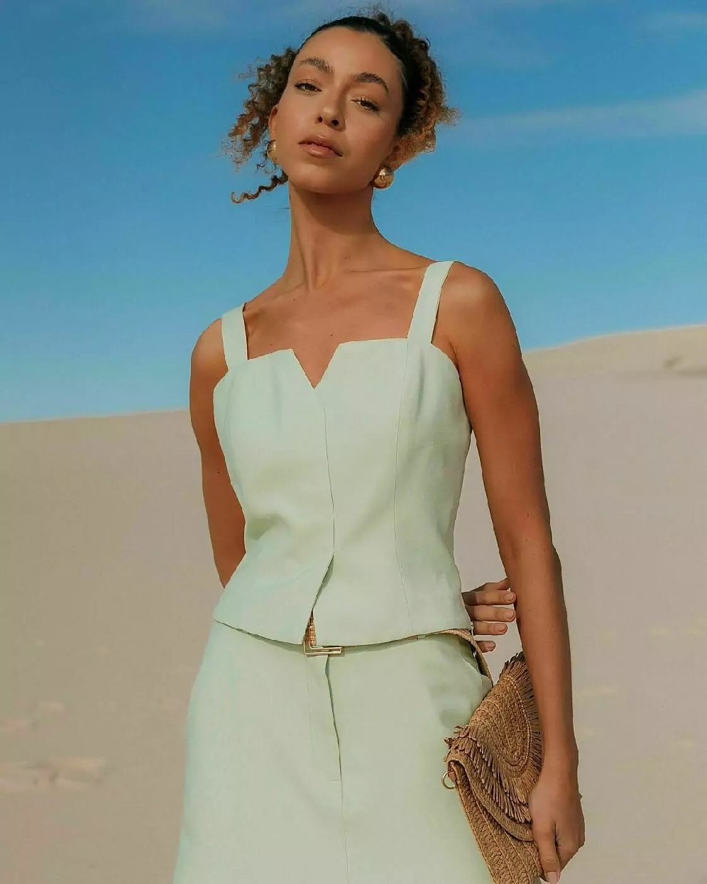A regata em twill traz corte estruturado e detalhe de abertura frontal que valoriza a modelagem com sofisticação. Versátil e elegante, é a peça ideal para compor produções atemporais que transitam do dia para a noite com estilo refinado.REF:013217