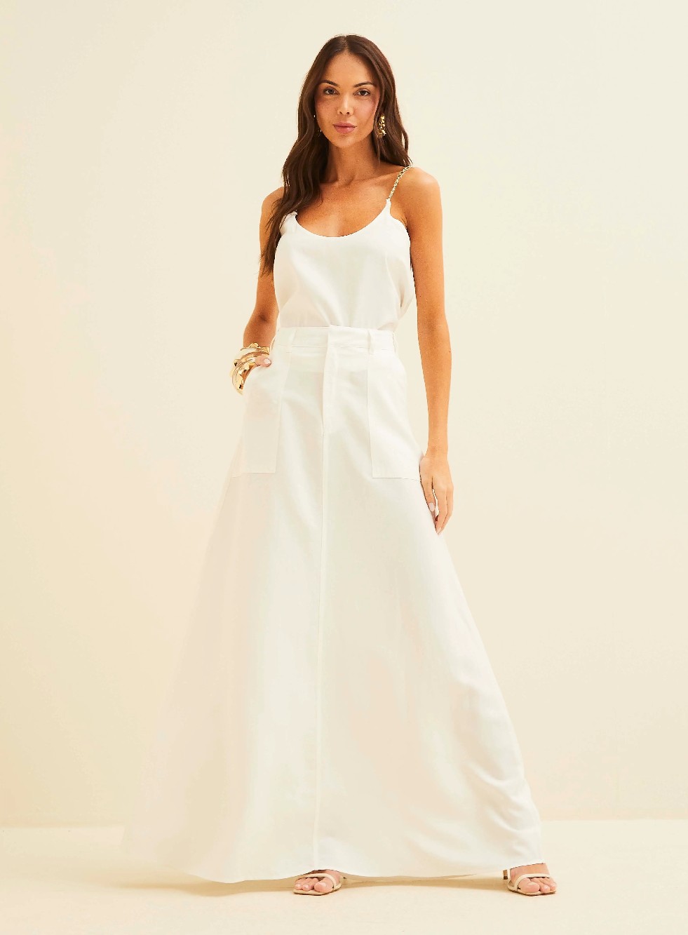 A Saia Linho Forum Off Shell é a escolha ideal para quem busca elegância e frescor nos dias mais quentes. Feita em linho de alta qualidade, ela combina sofisticação e conforto, sendo perfeita para criar looks tanto casuais quanto para eventos mais especiais.