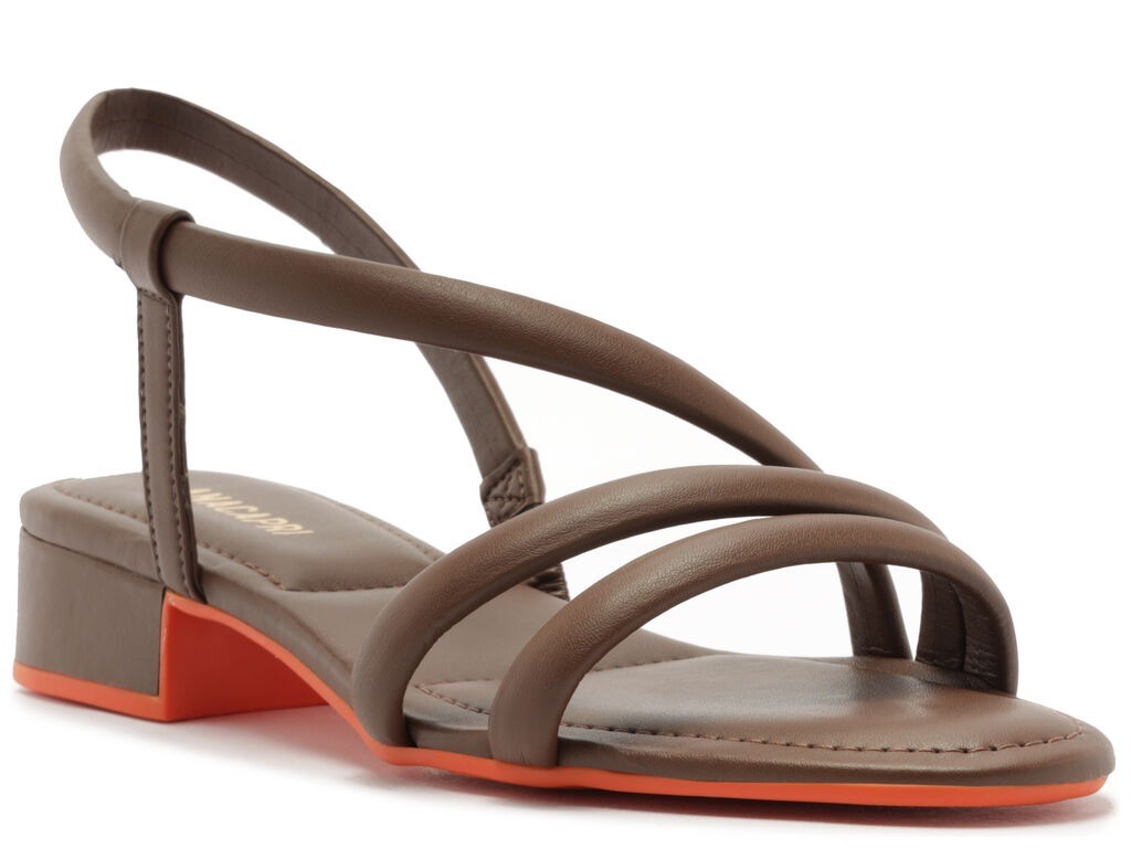 Sandália de salto bloco marrom, com detalhe em tira assimétrica. O modelo de material similar ao couro com efeito fosco apresenta salto em bloco baixo e biqueira arredondada. Possui cabedal com duas tiras médias acolchoadas sobre os dedos, outra que perpassa em curva no peito de pé presa por tirinha em uma das laterais com parte traseira elástica em meia cana transversal - que passa pelo tornozelo, contornando o calcanhar pela lateral. Traz palmilha comfy acolchoada, com assinatura Anacapri e detalhe em tom contrastante no contorno de todo o solado.