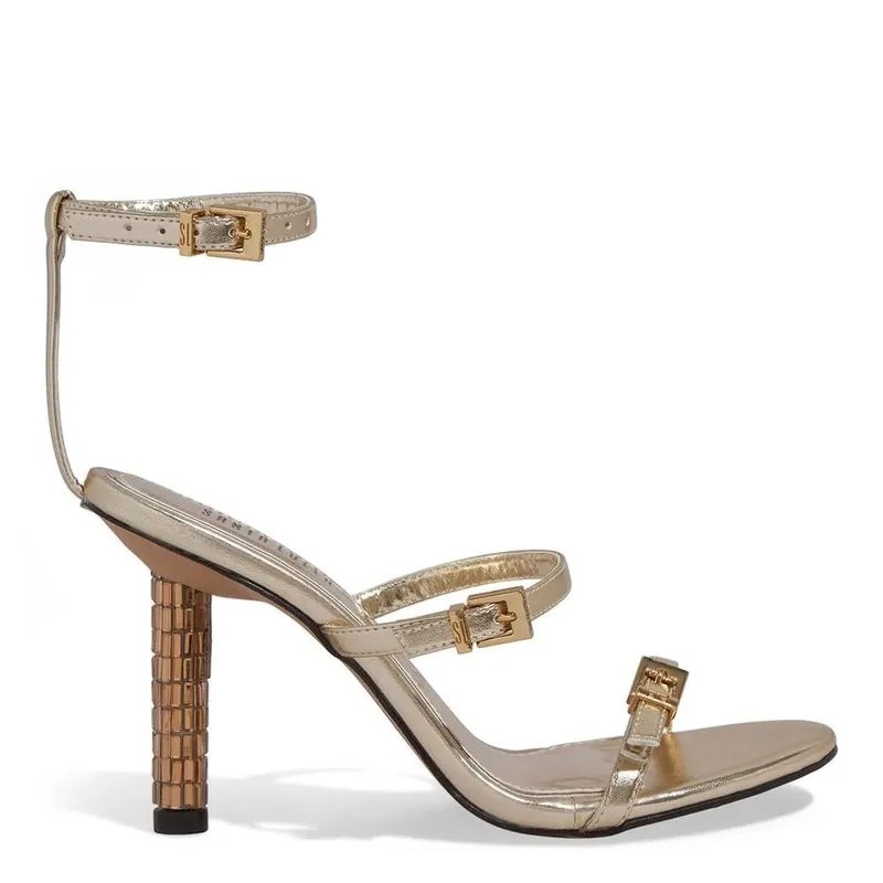 Sandália confeccionada em material tecnológico metalizado, garantindo brilho sofisticado e visual moderno. O design minimalista apresenta tiras finas no cabedal com detalhes de fivelas metálicas e fechamento ajustável no tornozelo, proporcionando segurança e elegância. O destaque fica por conta do salto alto cilíndrico com acabamento geométrico espelhado, que adiciona personalidade ao look. Ideal para compor produções glamorosas em festas e eventos especiais.Material Tecnológico