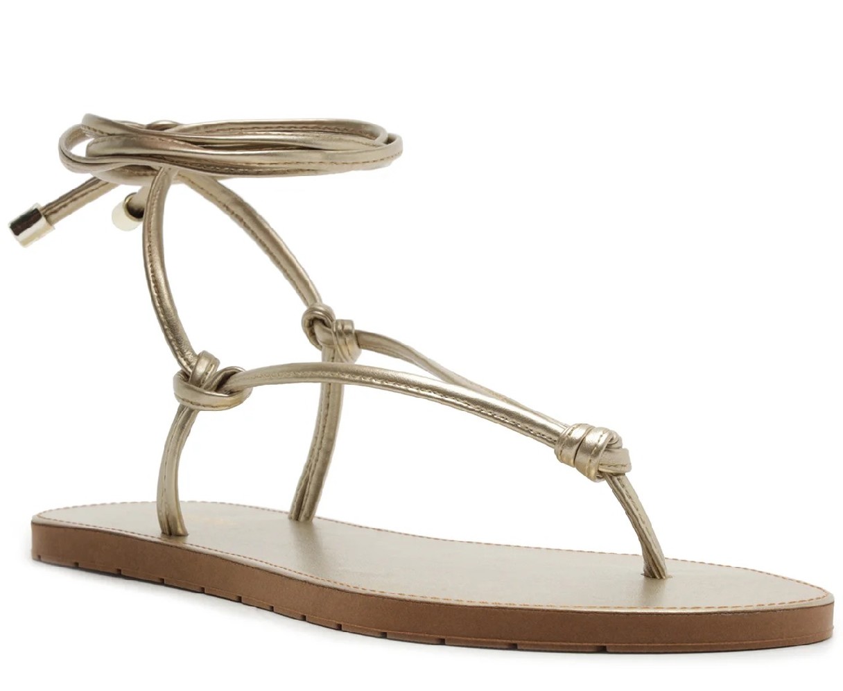 Sandália de dedo de amarração e detalhe em nó, na cor dourada. Possui uma tira central lisa, que passa entre os dedos e segue pelas laterais, arrematada em nozinhos, na parte central e nas laterais do modelo, com fecho por amarração no tornozelo com ponteiras metálicas. Apresenta solado emborrachado, com leve tratorado. Traz palmilha acolchoada, no mesmo tom da sandália, com assinatura Anacapri em carimbo metálico. Deixa os dedos, laterais e calcanhar à mostra.Material: Material Tecnológico