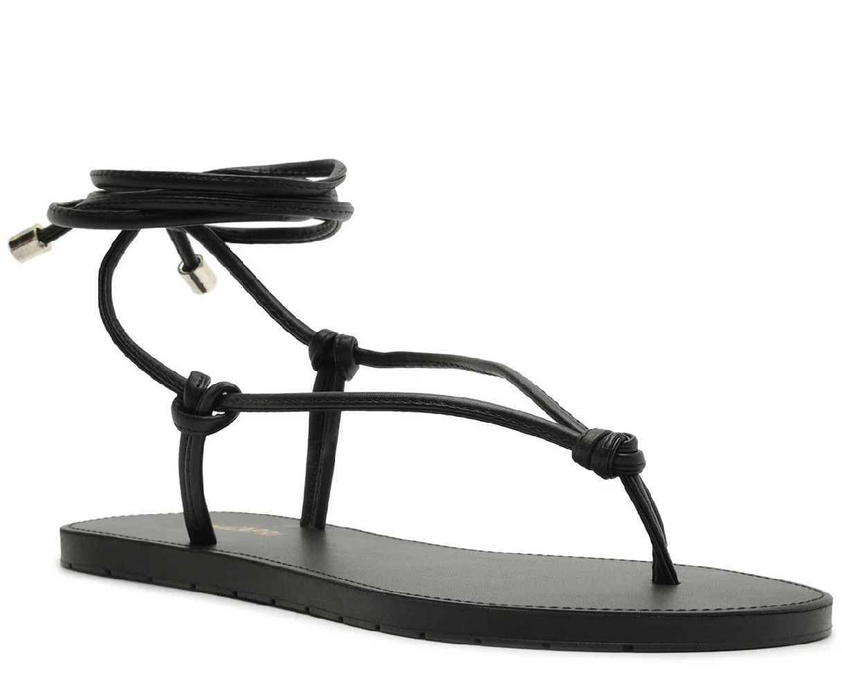 Sandália de dedo de amarração e detalhe em nó, na cor preta. Possui uma tira central lisa, que passa entre os dedos e segue pelas laterais, arrematada em nozinhos, na parte central e nas laterais do modelo, com fecho por amarração no tornozelo com ponteiras metálicas. Apresenta solado emborrachado, com leve tratorado. Traz palmilha acolchoada, no mesmo tom da sandália, com assinatura Anacapri em carimbo metálico. Deixa os dedos, laterais e calcanhar à mostra.Material: Material Tecnológico