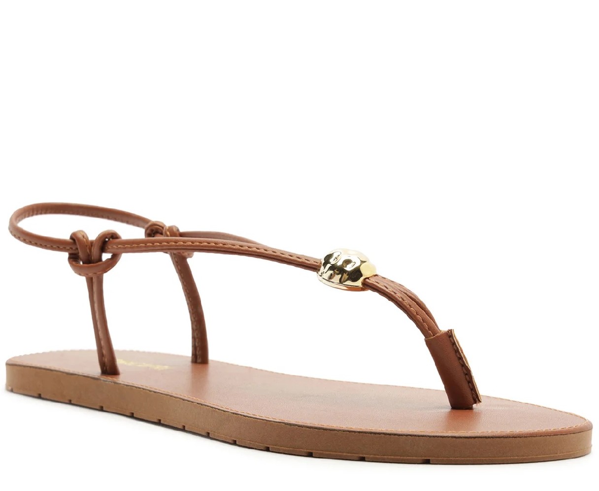 Sandália rasteira com detalhe em adorno metálico, na cor marrom. Apresenta cabedal com tira dupla que separa os dedos. Possui tira sobre o peito de pé, com traseira que contorna o tornozelo, presa pelas laterais - proporcionando um calce de encaixe, com regulagem. Detalhe para aplicação de adorno metálico central que prende as tiras na gáspea. Possui solado emborrachado, com leve tratorado. Traz palmilha acolchoada, no mesmo tom da sandália, com assinatura Anacapri em carimbo metálico.Material Tecnológico