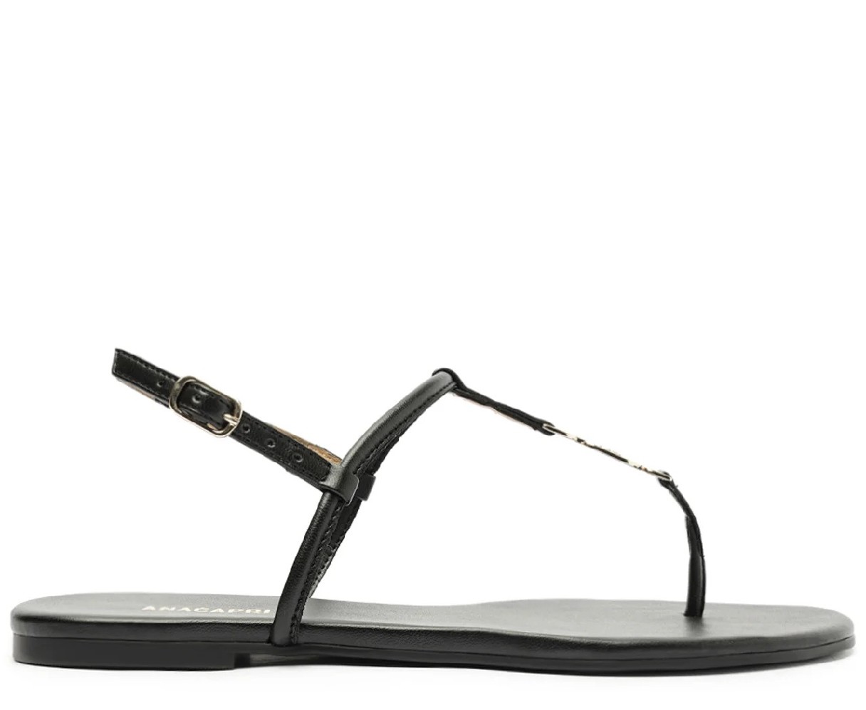 Sandália Rasteira slim, com detalhe metálico em A, na cor preta. O modelo possui solado rasteiro e emborrachado, com leve saltinho traseiro. Com biqueira arredondada e em material similar ao couro, traz uma tira fininha sobre o peito de pé e uma central entre os dedos, com aplicação de maxi pingente metálico, com inscrição da inicial A - assinatura Anacapri - centralizada no adorno exclusivo. Na parte traseira, traz fecho em fivela regulável, contornando o calcanhar. Com palmilha comfy de mesmo tom da peça e assinatura Anacapri.Material: Material Tecnológico
