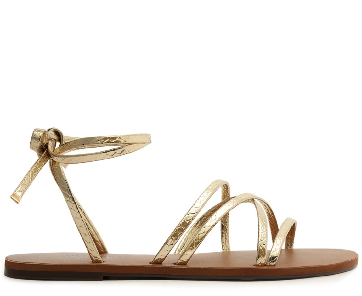 Rasteira de amarração e multitiras, na cor dourada. Com cabedal de material similar ao couro, com efeito metalizado e texturizado em animal print de cobra, o modelo traz quarteto de tirinhas finas - com design imponente: uma sobre os dedos, duas que se cruzam no centro e finaliza com outra na horizontal. Traz duas tirinhas finas, presas na lateral da parte traseira, fechando em amarração superior no tornozelo, com ponteiras metálicas. Apresenta solado rasteiro emborrachado com leve saltinho traseiro e palmilha acolchoada, com assinatura Anacapri. Deixa os dedos, laterais e calcanhar à mostra.Material Tecnológico