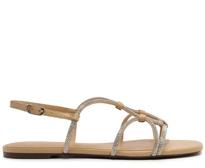 Sandália rasteira de multitiras glam, com adorno metálico, na cor bege. O modelo de material similar ao couro - com detalhe glam em manta brilhosa - apresenta cabedal com design vazado e imponente, com tiras bombadas, presas por tachas metálicas que se unem na parte central da peça - presas nas laterais. Possui uma tira fina bombada traseira, que contorna o calcanhar, com fecho afivelado lateral. De biqueira arredondada, possui solado emborrachado, com leve saltinho traseiro e palmilha nude, com assinatura Anacapri.Multimaterial