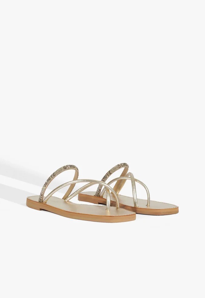 Aposte na elegância descomplicada. Esta sandália rasteira dourada é a peça-chave para um visual moderno e versátil. O design de tiras finas e o detalhe em strass no peito do pé trazem um toque de sofisticação e brilho. Perfeita para te acompanhar do dia à noite com muito conforto e estilo. Características Material: Multimaterial Cor: Dourado Tamanho do salto: 2,5 cm Referência: S2088901280003