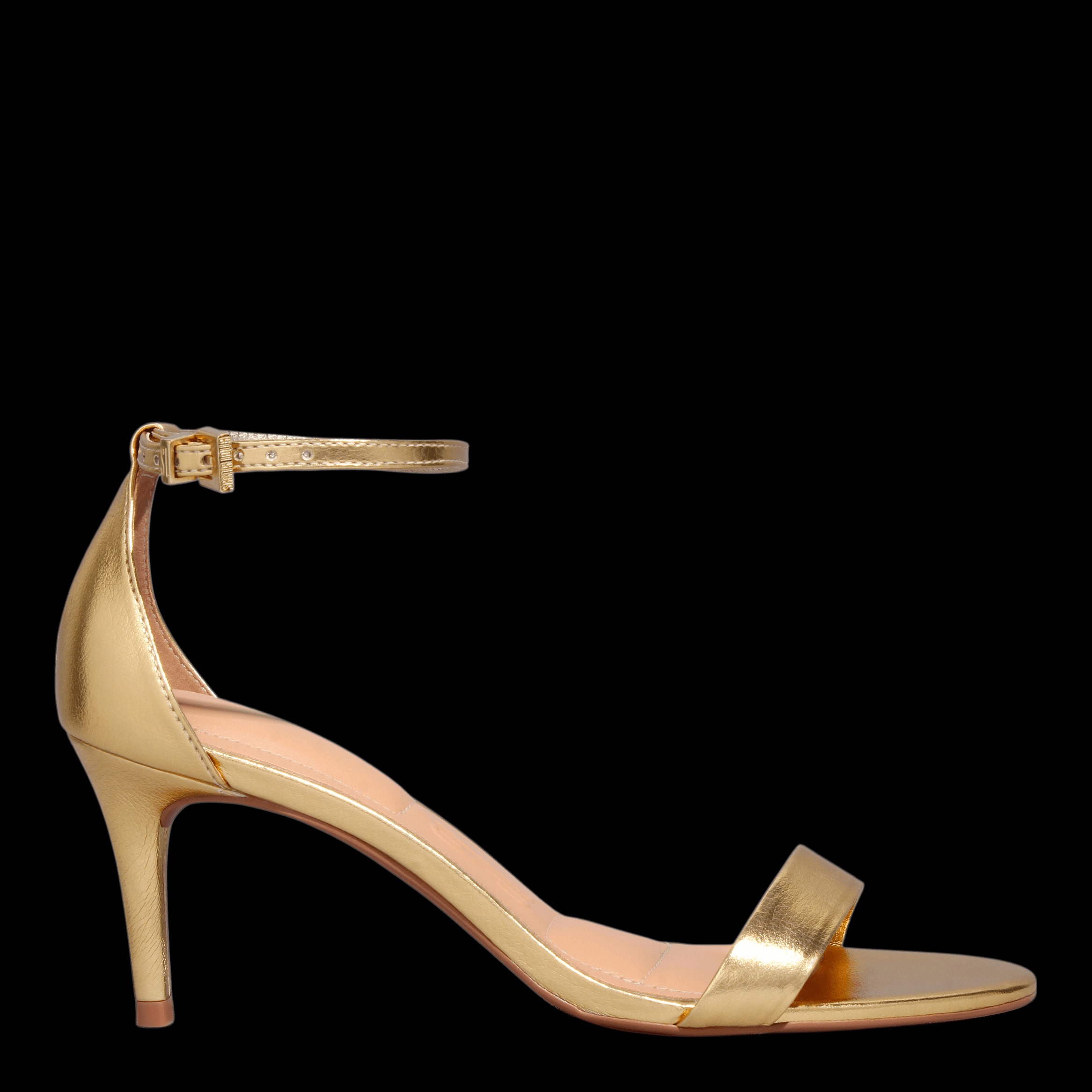 Sandália confeccionada em material tecnológico com acabamento metalizado, com acabamento dourado que adiciona brilho e sofisticação ao visual. O modelo possui salto fino, ideal para compor looks elegantes em ocasiões especiais. Seu design delicado valoriza o pé, enquanto o fechamento em fivela garante ajuste seguro e confortável. Uma escolha perfeita para quem busca estilo e glamour.Tipo de Bico Redondo Cor Dourado Material Material Tecnológico Fechamento Fivela Altura aproximada 7 cm Tipo de Salto Fino Código de Referência 0713.59E8.0339.001D