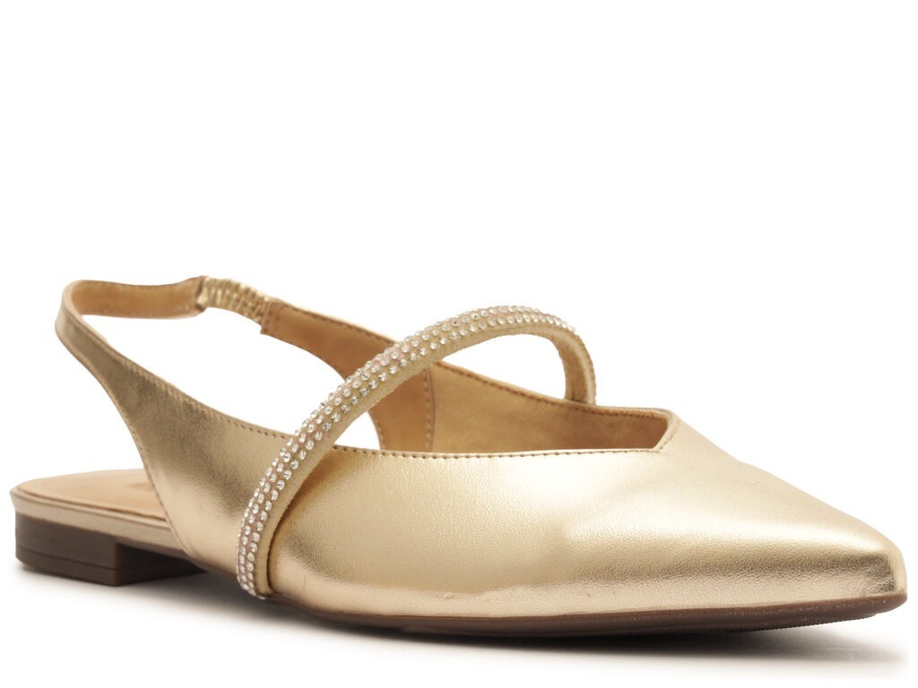 Sapatilha PW SHINE de bico fino dourada. O modelo de material similar ao couro possui solado emborrachado rasteiro com leve saltinho e bico fino. Estilo slingback - aberta atrás, possui recorte arredondado no cabedal, com detalhe de contorno e costura pesponto delicada. Traz tira fininha com detalhe afivelado ajustável sobre o peito do pé. Possui tiras finas conectadas ao cabedal que seguem pelas laterais em elástico, contornando o calcanhar. Com palmilha nude e assinatura Anacapri, a sapatilha slingback deixa o peito do pé e calcanhar à mostra.