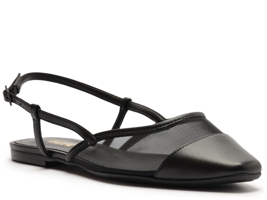 Sapatilha slingback com tela em transparência, na cor preta. O modelo apresenta solado rasteiro emborrachado com leve saltinho. Traz cabedal em tela transparente, com recorte arredondado sobre o peito de pé, com contornos e biqueira em material similar ao couro. Aberta atrás, possui tiras finas conectadas ao cabedal presas pelas laterais, que contornam o calcanhar, com fecho afivelado ajustável. #REF:C3035600160002