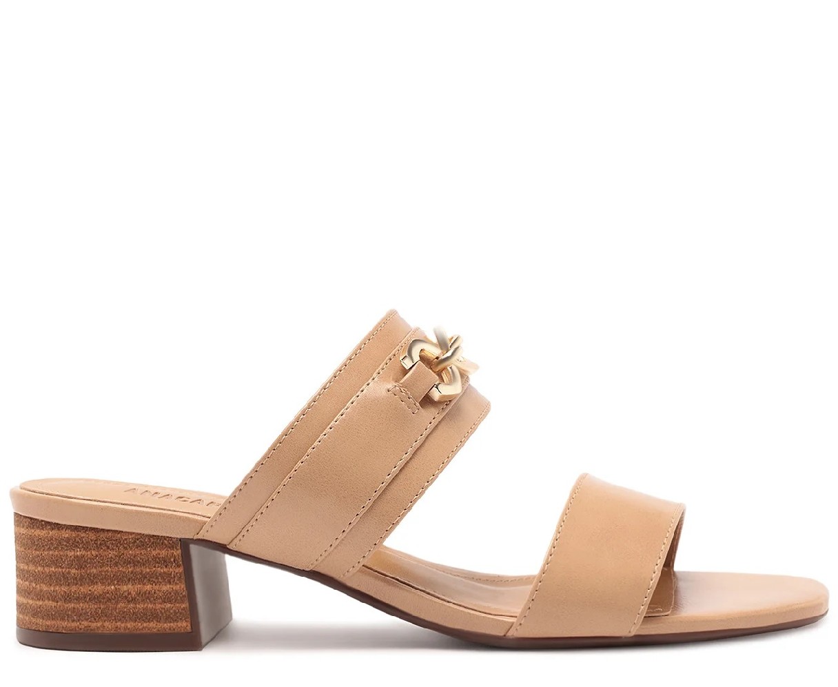 Tamanco de salto bloco, com detalhe em elos metálicos, na cor bege. O modelo apresenta cabedal em material similar ao couro, com duas tiras - uma sobre os dedos, outra mais larga sobre o peito de pé, com detalhe imponente em aplicação de tira sobreposta, com maxi elos metálicos - estilo corrente na tira traseira. De biqueira quadrada, possui salto em bloco médio e palmilha comfy, com assinatura Anacapri. Aberta atrás, a sandália mule deixa os dedos e calcanhar à mostra.Material Tecnológico