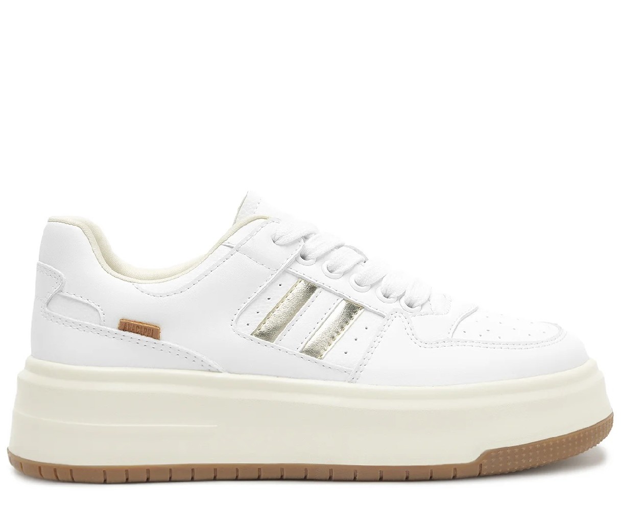 Tênis Aura de amarração, com detalhe de recortes e perfuros, em branco e dourado. O modelo apresenta nova construção no solado - mais alto e estruturado, traz sola flatform emborrachada em branco com detalhe texturizado e tratorado marrom. Com um design robusto com aplicação em mix de peças em camurça recortadas por todo o cabedal, traz acabamentos em costura pespontada nos contornos e perfuros nas laterais e biqueira, proporcionando maior respirabilidade para o tênis. De amarrar, com atacadores brancos e detalhe em listras prateadas com efeito metalizado em diagonal, na lateral do tênis. Aplicação de tag marrom na lateral traseira, com assinatura Anacapri.Material Tecnológico
