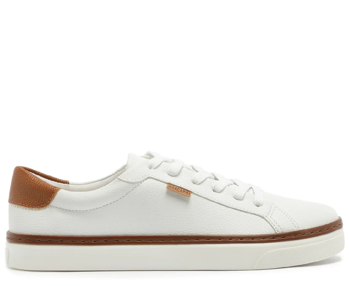 Tênis Paula branco com detalhe em listra marrom. O modelo de material similar ao couro possui solado emborrachado branco e atacadores de mesmo tom do tênis. Traz aplicação de peça marrom na parte traseira e listra de mesmo tom em todo o contorno inferior. Forrado na parte interna, apresenta costura pespontada delicada e aplicação de tag lateral marrom Anacapri.Material Tecnológico Cor: Branco Referência: C3013300010005