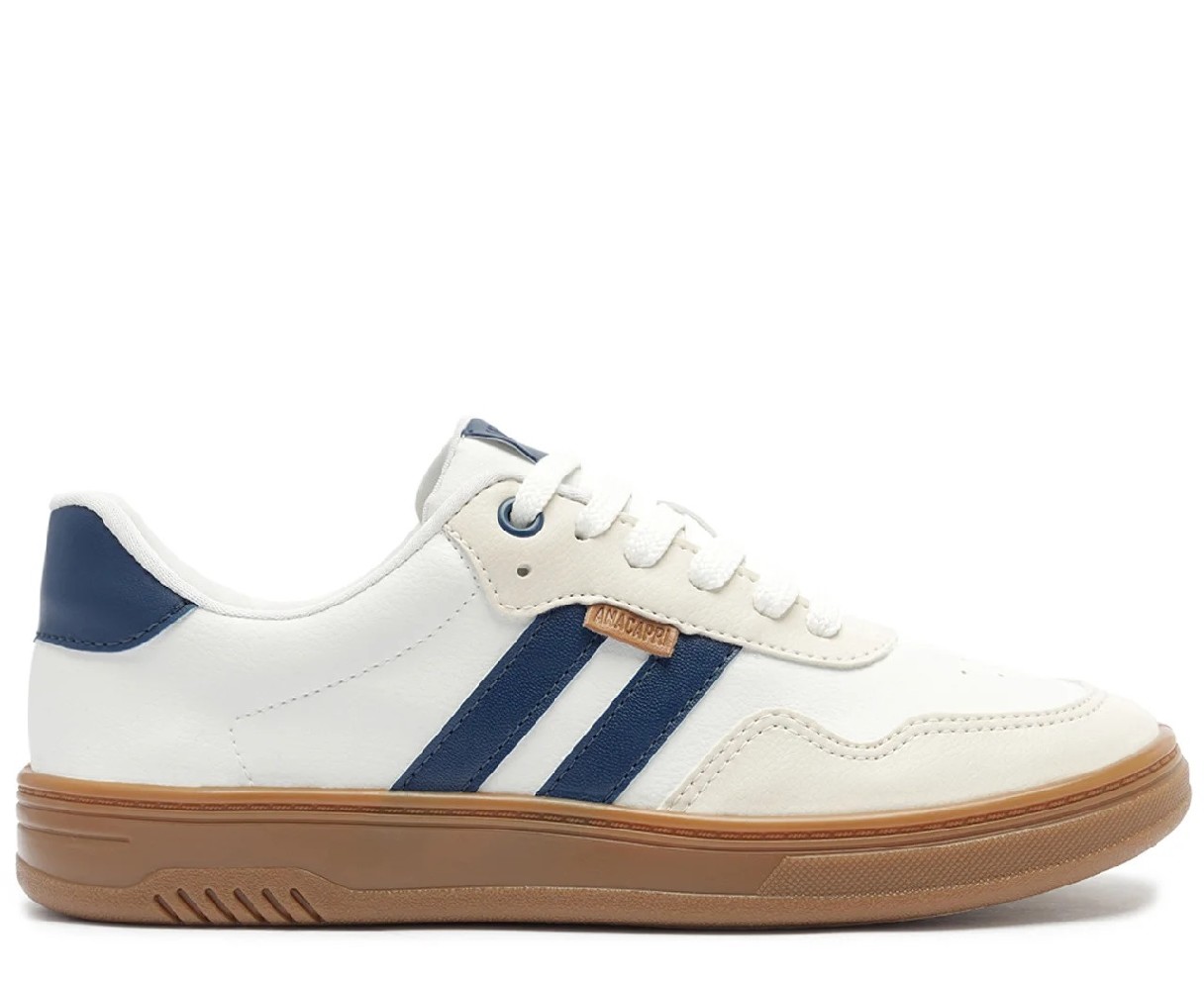 Tênis Lua com detalhe em listra dupla, em branco e azul. O modelo traz o shape clássico do tênis Smart A, totalmente repaginado para a temporada de inverno Anacapri. De material similar ao couro, apresenta detalhe em costura pespontada imponente no contorno da biqueira, pontilhado nas laterais e perfuros na parte superior, proporcionando respirabilidade para o tênis. Apresenta duas listras laterais contrastantes em azul, com aplicação de peça traseira no mesmo tom das listras. Possui detalhe moderno e texturizado com design no solado, proporcionando maior conforto e estabilidade no calce. De amarração por atacadores, traz assinatura Anacapri na palmilha, tag marrom lateral e etiqueta emborrachada Anacapri na lingueta.Material Tecnológico