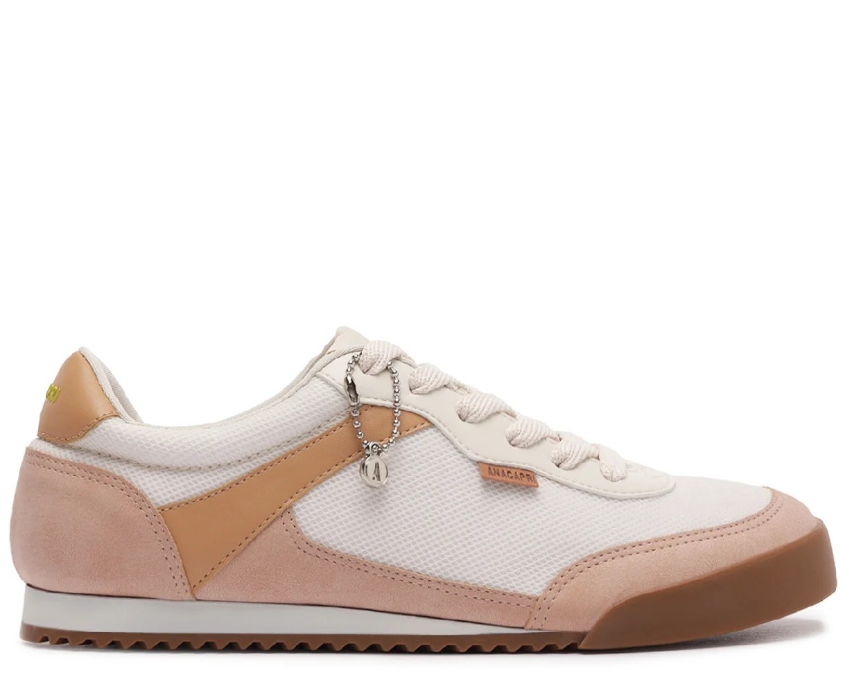 Tênis Lucy, com detalhe de recortes e pingente, em branco e bege. De solado baixo emborrachado em goma vulcanizada e tratorada marrom, com detalhe traseiro em branco. O modelo de cabedal em nylon, apresenta design de costura pesponto nas laterais e contornos, com aplicação de peças em camurça e napa - nos tons de bege e marrom - na biqueira, laterais e parte traseira. De amarrar, com atacadores brancos, possui aplicação de tag lateral marrom Anacapri. Destaque para pingente metálico redondo com assinatura Anacapri, preso na lateral da peça, por correntinha delicada.Multimaterial