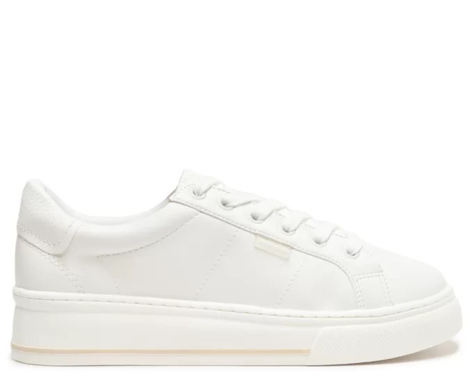 Tênis Sola Alta Listra Bege E Branco. O modelo vem com solado alto flatform branco e detalhe em listra nude. De shape redondo, corpo em napa esportivo branco com detalhamento em pespontos aparentes de mesmo tom, com estilo de recorte nas laterais do cabedal. Apresenta parte traseira e lingueta em napa branco em textura animal print de iguana. Com aplicação de etiqueta lateral emborrachada transparente, com inscrição do nome da marca em branco. De amarração, com atacadores em branco e inscrição do nome da marca na palmilha.