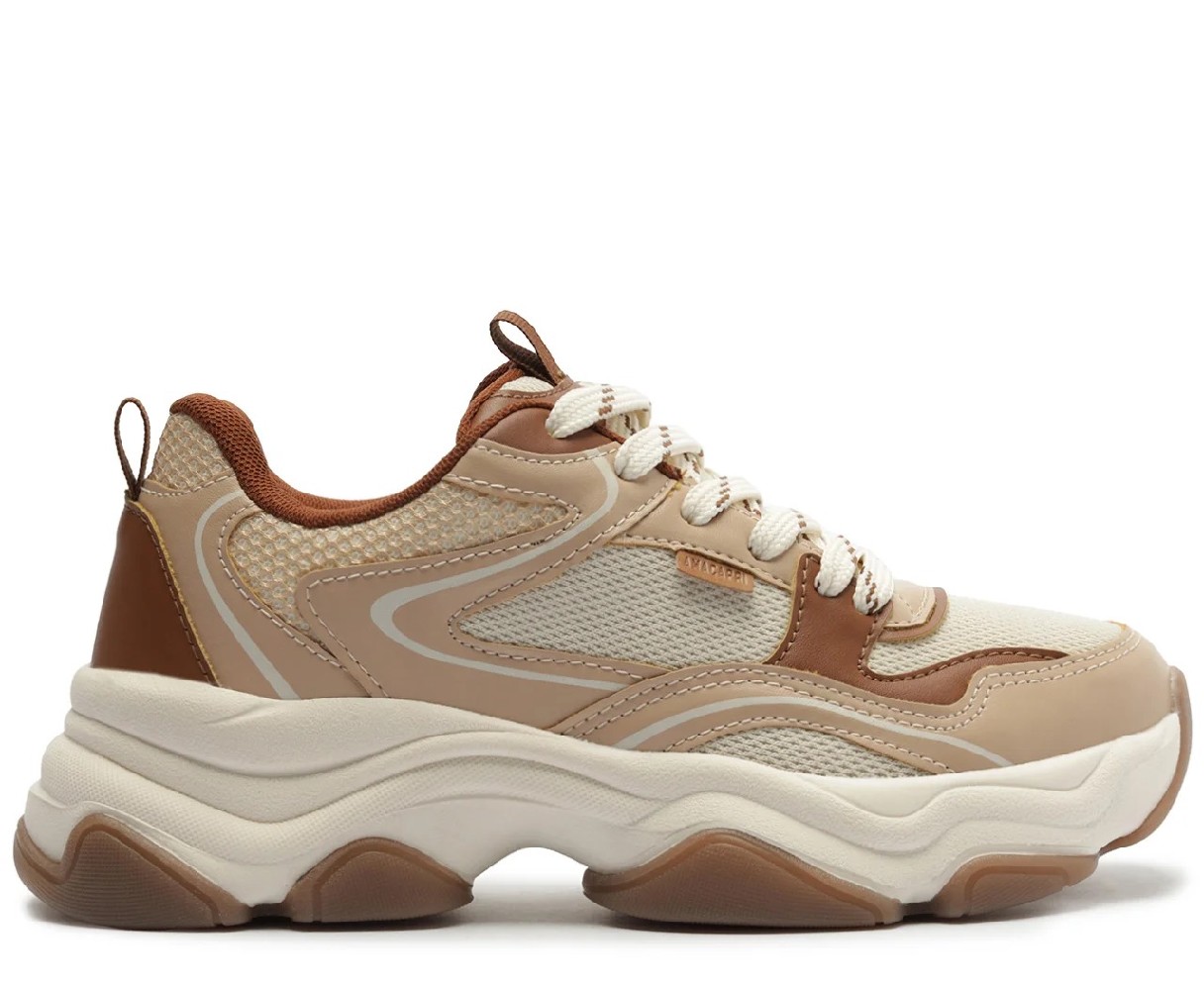 Tênis chunky Alexa, em branco e marrom. Com design de recortes modernos, possui aplicação de peças em napa nos tons de bege e marrom na biqueira, lingueta, laterais e calcanhar, com acabamento em pesponto delicado nos contornos. Traz atacadores bicolores e cabedal em tecido de nylon e tela smash. O cabedal telado proporciona maior respirabilidade para o tênis. Com novo solado chunky robusto e tecnológico branco com detalhes em marrom. Traz puxadores em fita de gorgurão aplicados na lingueta e na parte traseira, facilitando o calce. Tag marrom lateral com assinatura Anacapri.Multimaterial
