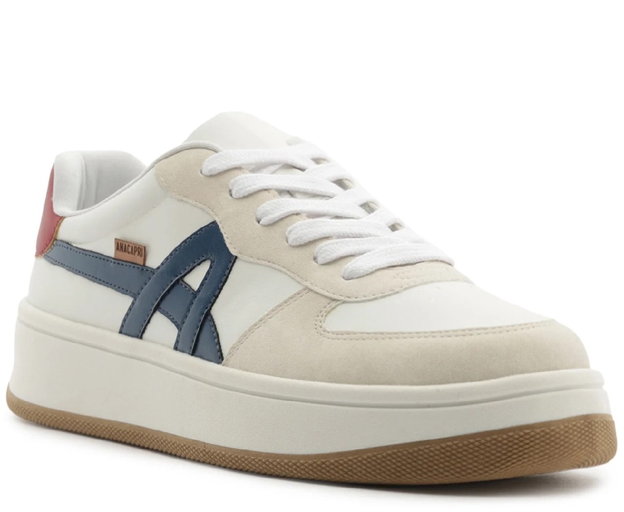 Tênis flatform de amarração, com detalhe de recortes, branco e multicolor. Com um design imponente com aplicação em mix de peças recortadas em napa vermelha no calcanhar, traz acabamentos em costura pesponto nos contornos e peças em camurça bege aplicadas na biqueira e lingueta. De amarrar, com atacadores brancos e aplicação de tag marrom lateral Anacapri. Destaque para peça recortada com design em A em napa azul, aplicada na lateral, em direção a parte traseira do tênis. O modelo apresenta solado flatform emborrachado branco e base em goma vulcanizada marrom.Multimaterial