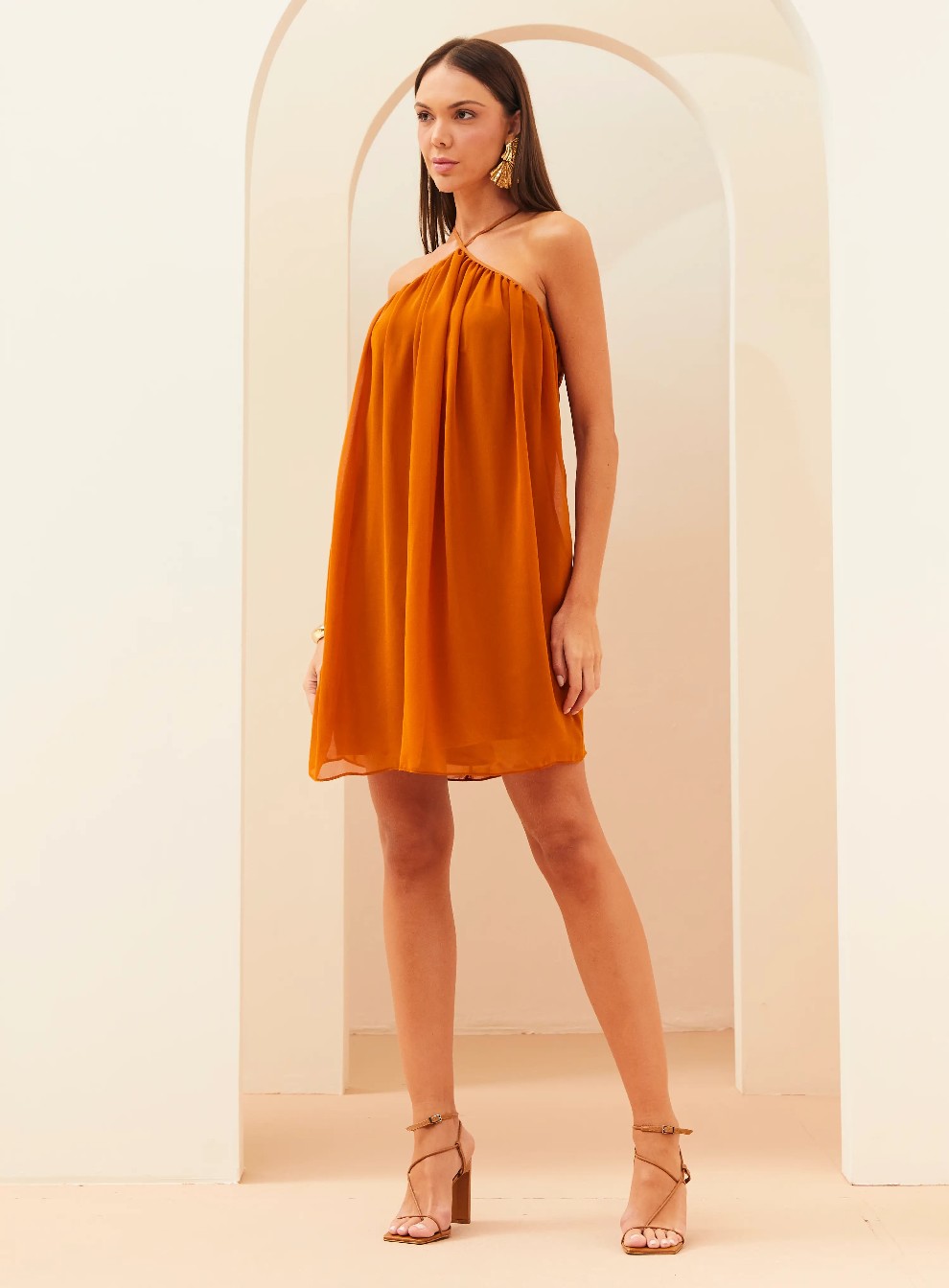 Ele possui modelagem solta/fluida (ampla), comprimento curto, e estilo frente única (halter neck) com costas decotadas. O grande destaque do design é o detalhe de amarração/ajuste nas costas, que confere um toque sofisticado e permite que as alças se cruzem. O tecido é leve e esvoaçante,o que garante um caimento impecável e um toque suave. Este modelo é perfeito para um visual que vai do casual diurno a um look noturno refinado.REF:044.46.11701