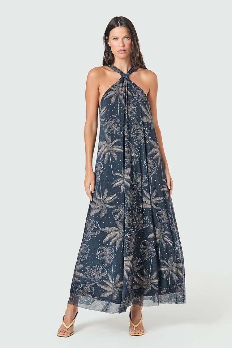 O Vestido Longo Slywear na tonalidade Dark (azul marinho escuro ou preto) é uma peça de impacto que exala o charme tropical chic. Confeccionado em tecido leve e fluido como chiffon ou crepe, garante um caimento esvoaçante e confortável. A peça se destaca pelo decote halter cruzado no pescoço, que valoriza os ombros, e pelas costas abertas (decote nadador ou amplo) com um laço ou amarração na altura da nuca. A estampa tropical de folhagens e palmeiras, em tons terrosos/claros e com pequenos pontos de luz, é elegante e versátil.REF:554.086