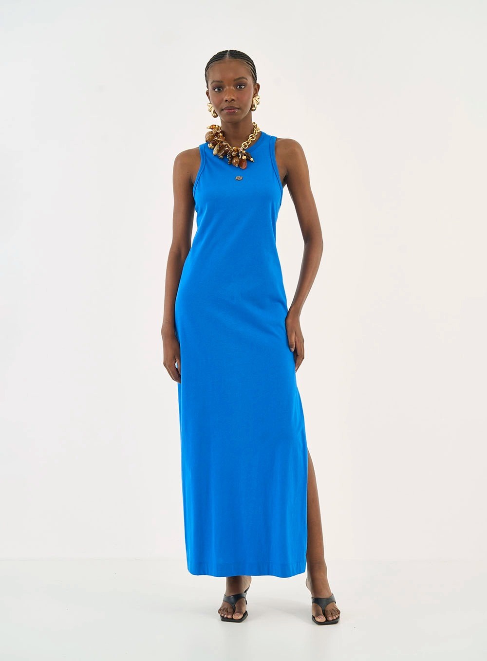Design: Corte reto com modelagem Comfort, decote redondo clássico e cavas confortáveis. O comprimento midi é modernizado pelas fendas laterais profundas, que garantem movimento fluido e um toque de sensualidade velada ao caminhar.