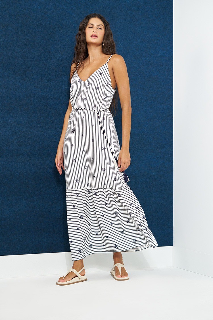 Possui modelagem envelope (wrap) com decote V e alças finas reguláveis. É confeccionado em viscose leve com alta porcentagem de fibras naturais, o que garante frescor, caimento leve e máximo conforto. O design é marcado pela estampa listrada (azul marinho e off white). Seus detalhes técnicos incluem um corte com barrado em camadas e um cinto removível com detalhe de tassel na ponta, que permite ajustar a silhueta, sendo ideal para um visual elegante e casual.REF:554.044